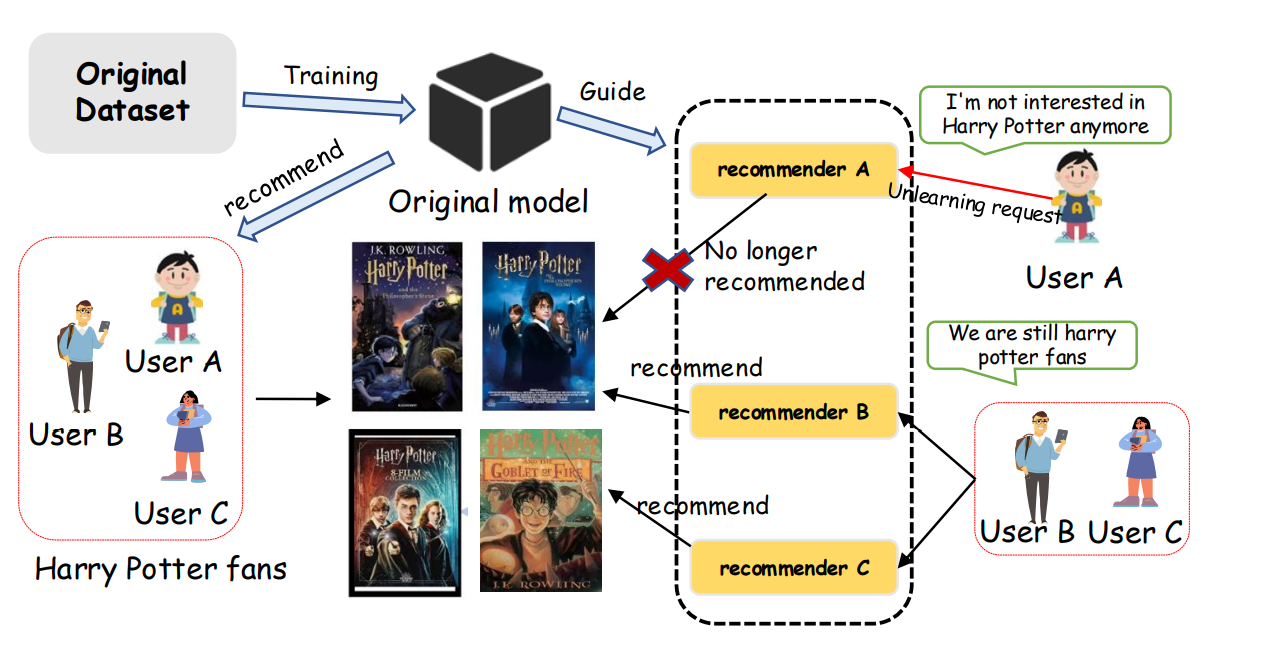 Completeness (Fig. 3). HR/NDCG drop on the forget set confirms thorough unlearning.